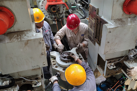 李祥和羅志成是4月就派往現場的,因萬能軋機是由7組機架組成,而相鄰的兩臺機架共用一個底座,安裝過程的每一步都需要控制好公差范圍,稍有不慎,就可能因解決后邊發生的問題而影響了前面的調試結果,可謂“牽一發而動全身”。兩位師傅憑借多年的工作經驗,從容應對,積極配合業主和施工方,解決各類裝配問題。有時為了趕工期與施工方一起值守到深夜,第二天為了項目需要又早早抵達項目現場開始新一天的工作。