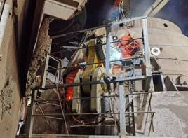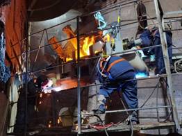 由賽迪股份總包、賽迪裝備承制的寶鋼集團新疆八一鋼鐵有限公司“150噸轉爐懸掛改型工程”項目,需要在項目現(xiàn)場進行焊接,承接現(xiàn)場焊接的協(xié)力公司能力有限,轉爐安裝焊接工作進度滯后了半個月。為保工期,在集團與公司各級領導的指導與協(xié)調(diào)下,公司制造中心分別于12月16日、17日、20日,分三批緊急抽調(diào)了14名(含外包隊伍)車間工作經(jīng)驗豐富的焊接師傅,由結構車間主任張勇帶隊趕赴現(xiàn)場支援。到現(xiàn)場后還沒來得及休整即召開緊急會議,并查看現(xiàn)場實地情況,發(fā)現(xiàn)整個爐體上段工作還未開展;下段4個爐殼吊掛座還未焊接,4個托圈吊掛座焊了2個、還有2個未開始,同時已焊接的2個托圈吊掛座全部探傷不合格、需要刨開返修,工作量較大,加上全國大范圍寒潮來襲,新疆氣溫更是低至零下15度,低溫環(huán)境中需要進行焊條焊絲保溫、焊縫預熱等很多準備工作。會后大家就立刻投入到24小時的輪番作業(yè)中。
