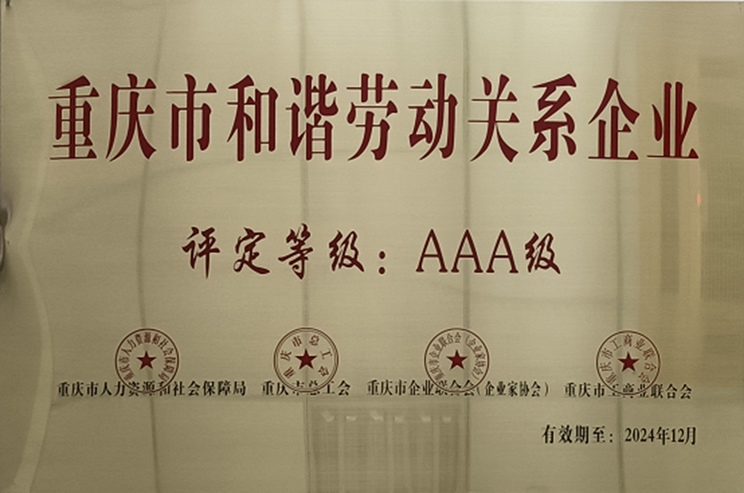 2022年11月3日,公司獲重慶市人社局、總工會、工商聯等有關部門授牌,標志著公司正式通過重慶市和諧勞動關系AAA級企業復評。