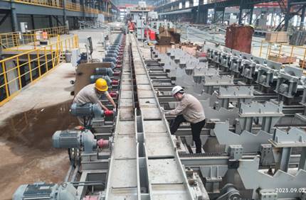 生產(chǎn)線靠前的連軋區(qū)域因賽迪裝備成熟而豐富的工程經(jīng)驗(yàn)進(jìn)展很順利,各項(xiàng)指標(biāo)均達(dá)到設(shè)計(jì)要求。然而9月18日臨近熱試節(jié)點(diǎn)時(shí),采用新工藝的編組區(qū)與冷床區(qū)因小問題疊加,調(diào)試時(shí)液壓缸損壞出現(xiàn)了漏油情況。為了確保20日的熱試節(jié)點(diǎn)“后墻不倒”,張程霖、周德洪、程江、夏棋、高陽5名設(shè)計(jì)當(dāng)天連夜收集現(xiàn)場流體液壓參數(shù)和應(yīng)用數(shù)據(jù),在沒有經(jīng)驗(yàn)可循的情況下逐個(gè)進(jìn)行分析、驗(yàn)證,加班加點(diǎn)制定出2套備用整改方案。19日,團(tuán)隊(duì)10余人擰成一股繩,在臨時(shí)黨支部書記、項(xiàng)目經(jīng)理趙遠(yuǎn)峰帶領(lǐng)下,黨員同志董立蘇、張程霖、高陽、張子念、周德洪等人充分發(fā)輝先鋒模范作用,帶頭逐一復(fù)核尺寸、校對液壓參數(shù),期間累了,就和著紙板鋪地上簡單休息一下,午餐晚餐也是匆匆扒幾口盒飯繼續(xù)投入戰(zhàn)斗。最終在“早八對早八“的通宵達(dá)旦拼搶下,編組與冷床區(qū)具備了熱試條件,于20日晚一次性熱負(fù)荷試車成功。