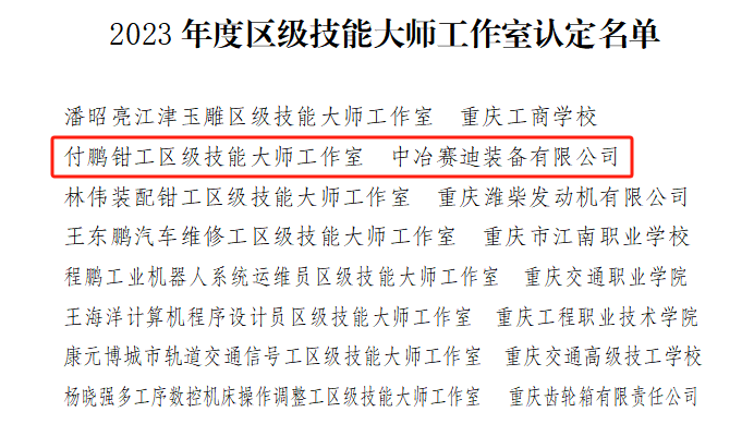 11月28日,中共重慶市江津區(qū)委組織部、江津區(qū)人力資源和社會保障局聯(lián)合下發(fā)《關于建立2023年度區(qū)級高技能人才培訓基地和區(qū)級技能大師工作室的通知》,以公司骨干員工付鵬命名的“付鵬鉗工區(qū)級技能大師工作室”成功獲評,同時賽迪裝備成功獲評江津區(qū)首批區(qū)級高技能人才培訓基地。值得一提的是,裝備公司是本次評選中同時獲批2個項目的企業(yè)。