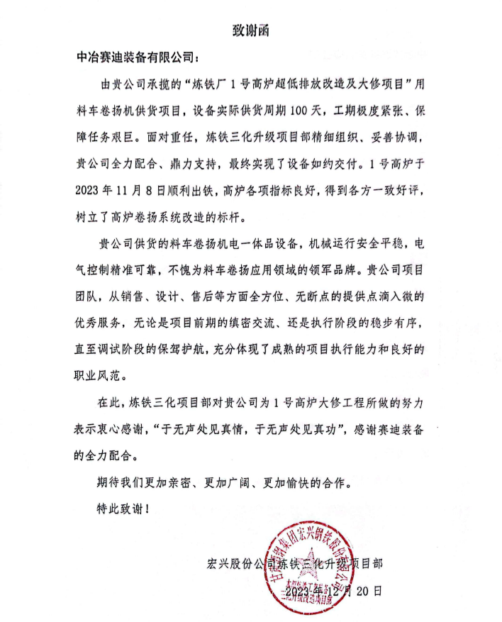 致謝函中提到,在“1號高爐超低排放及大修工程”中,賽迪裝備供貨的料車卷揚機電一體品設備,機械運行安全平穩,電氣控制精準可靠,不愧為料車卷揚應用領域的領軍品牌。賽迪裝備項目團隊,從銷售、設計、售后等方面全方位、無斷點的提供點滴入微的優秀服務,無論是項目前期的縝密交流、還是執行階段的穩步有序,直至調試階段的保駕護航,充分體現了成熟的項目執行能力和良好的職業風范。