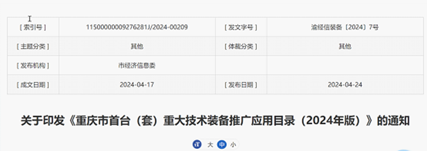 公司兩項新產品入選重慶市首臺(套)重大技術裝備推廣應用目錄