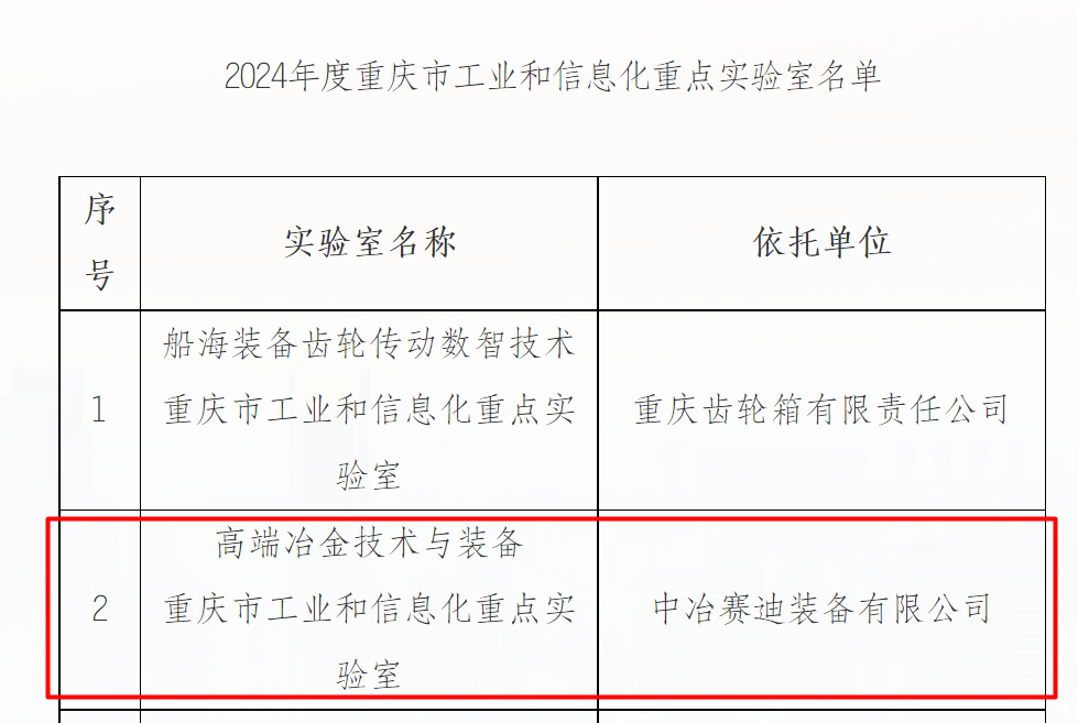 2024年9月19日,重慶市經(jīng)濟(jì)和信息化委員會認(rèn)定中冶賽迪裝備建設(shè)的“高端冶金技術(shù)與裝備”實(shí)驗室為2024年度重慶市工業(yè)和信息化重點(diǎn)實(shí)驗室。
