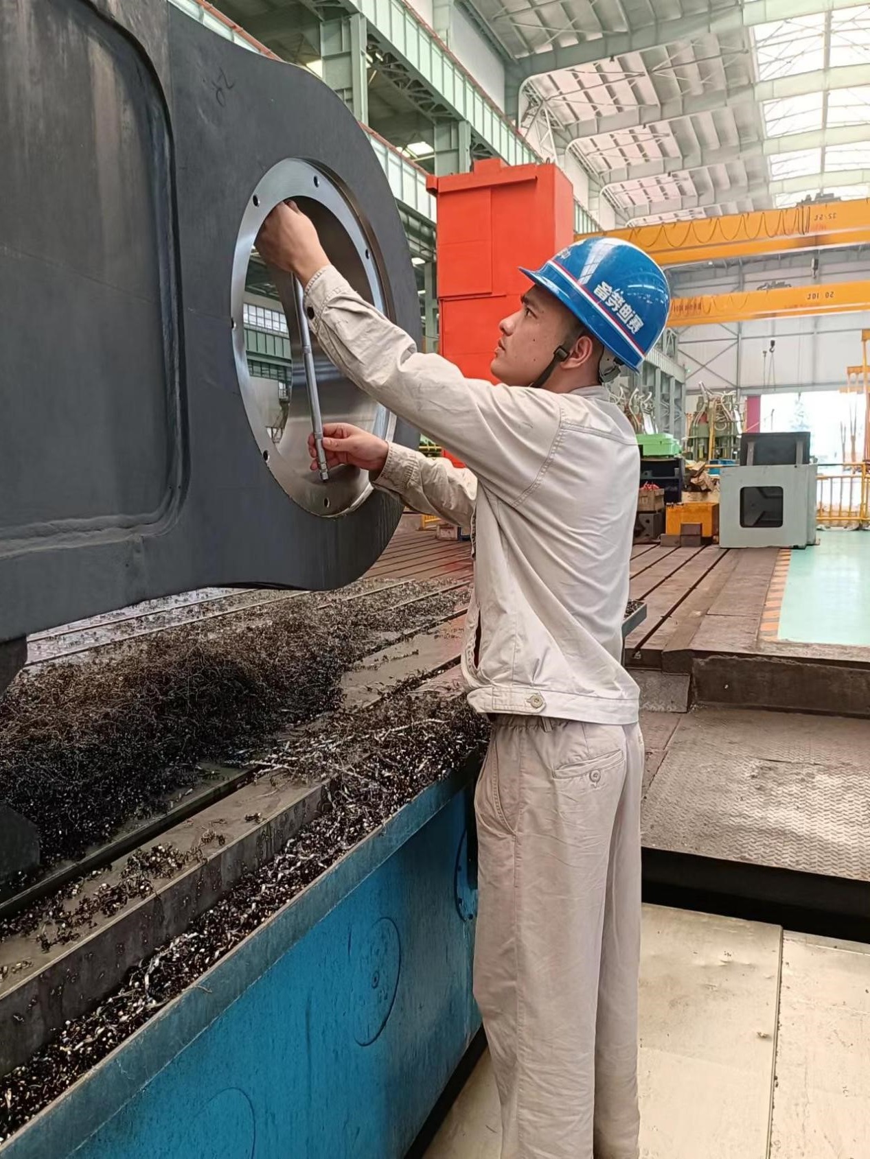在公司首次承制的“傾動(dòng)減速機(jī)”項(xiàng)目中,其箱體中心孔為直徑φ1750毫米,業(yè)內(nèi)還從未在鏜床上加工過(guò)如此大規(guī)格的孔。我們憑借多年經(jīng)驗(yàn),并多方考慮公司設(shè)備的特性,提出了“平旋盤(pán)+卡座+標(biāo)準(zhǔn)鏜盤(pán)”的加工方法,自主設(shè)計(jì)制作工裝,終于趕跑了這個(gè)“攔路虎”,完成了公司首次φ1500mm以上鏜孔的加工。這些核心裝備在客戶那里實(shí)現(xiàn)了穩(wěn)定運(yùn)行,幫助客戶生產(chǎn)出優(yōu)質(zhì)產(chǎn)品。這讓我感到由衷的自豪。