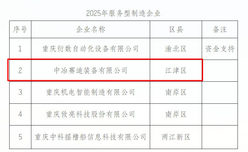8月11日,中冶賽迪裝備申報的"綠色冶金與高端裝備服務型制造企業"通過重慶市經濟和信息化委員會審批,成功入選重慶市2025年服務型制造企業,這標志著中冶賽迪裝備在科技創新、研發中試、制造型服務業建設以及引領行業產業轉型升級方面,取得階段性成果。